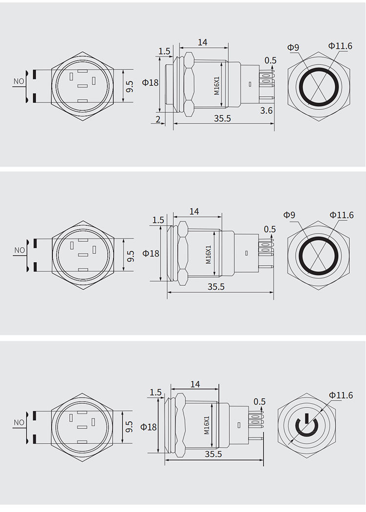 | Lamp type | Dot or Ring illuminated,Power symbol,Custom text |